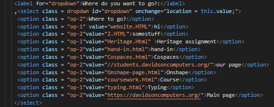 The Label part may not be needed but you add the select tags and then put whatever id and class you want. The "for" part of the label part to match the id though. You then add the option tags for however many options you want and in the value you put the name of the page or web site that you want the section to take you to.